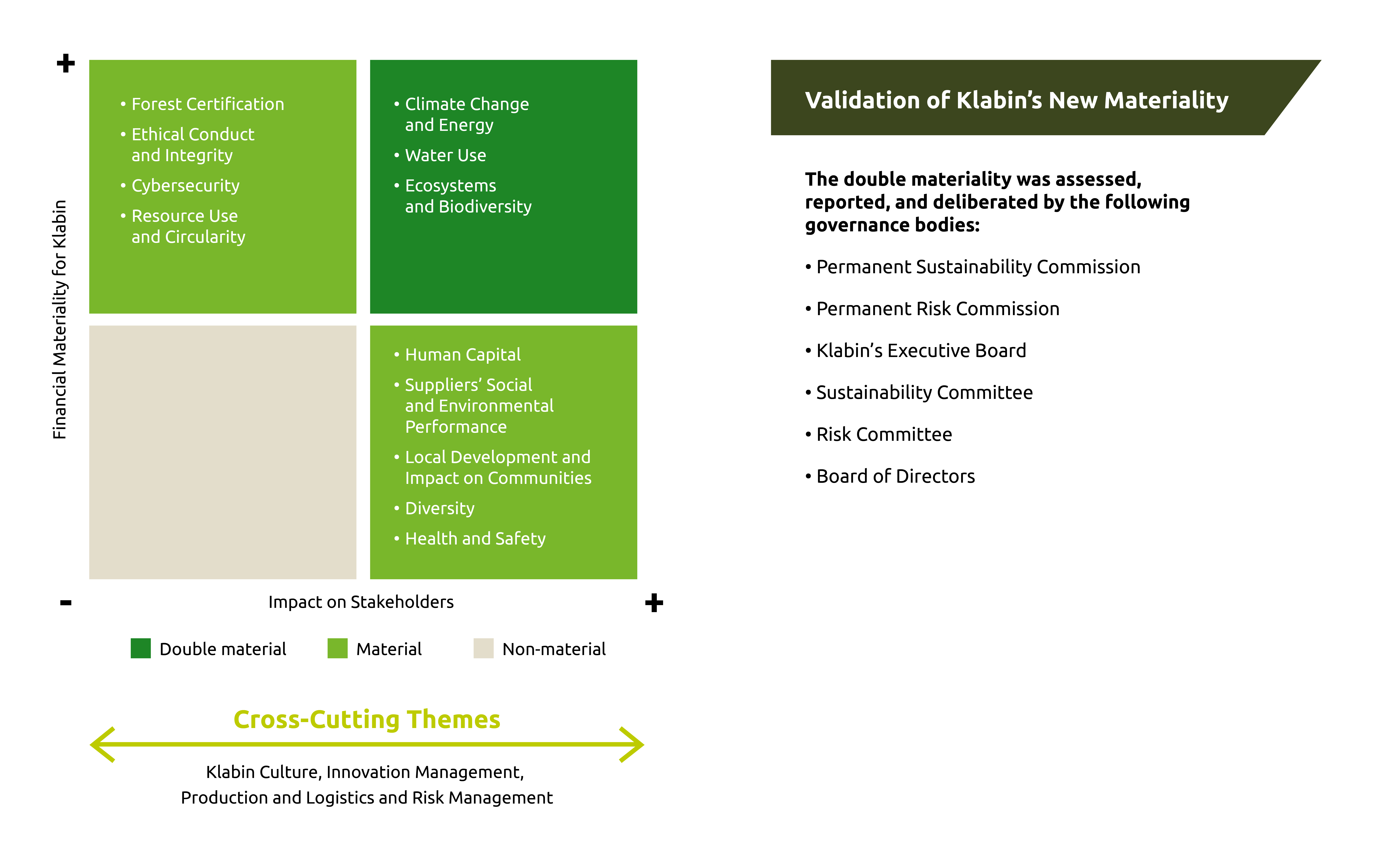 Klabin has been monitoring the implementation of ESRS (European Sustainability Reporting Standards) by the European Union and the reporting requirements for non-European companies. Based on this, it has restructured its Sustainability roadmap based on the concept of double materiality. This proactive approach allows Klabin not only to comply with future regulatory demands, but also to identify opportunities to improve internal processes and management practices on issues considered relevant to the company.