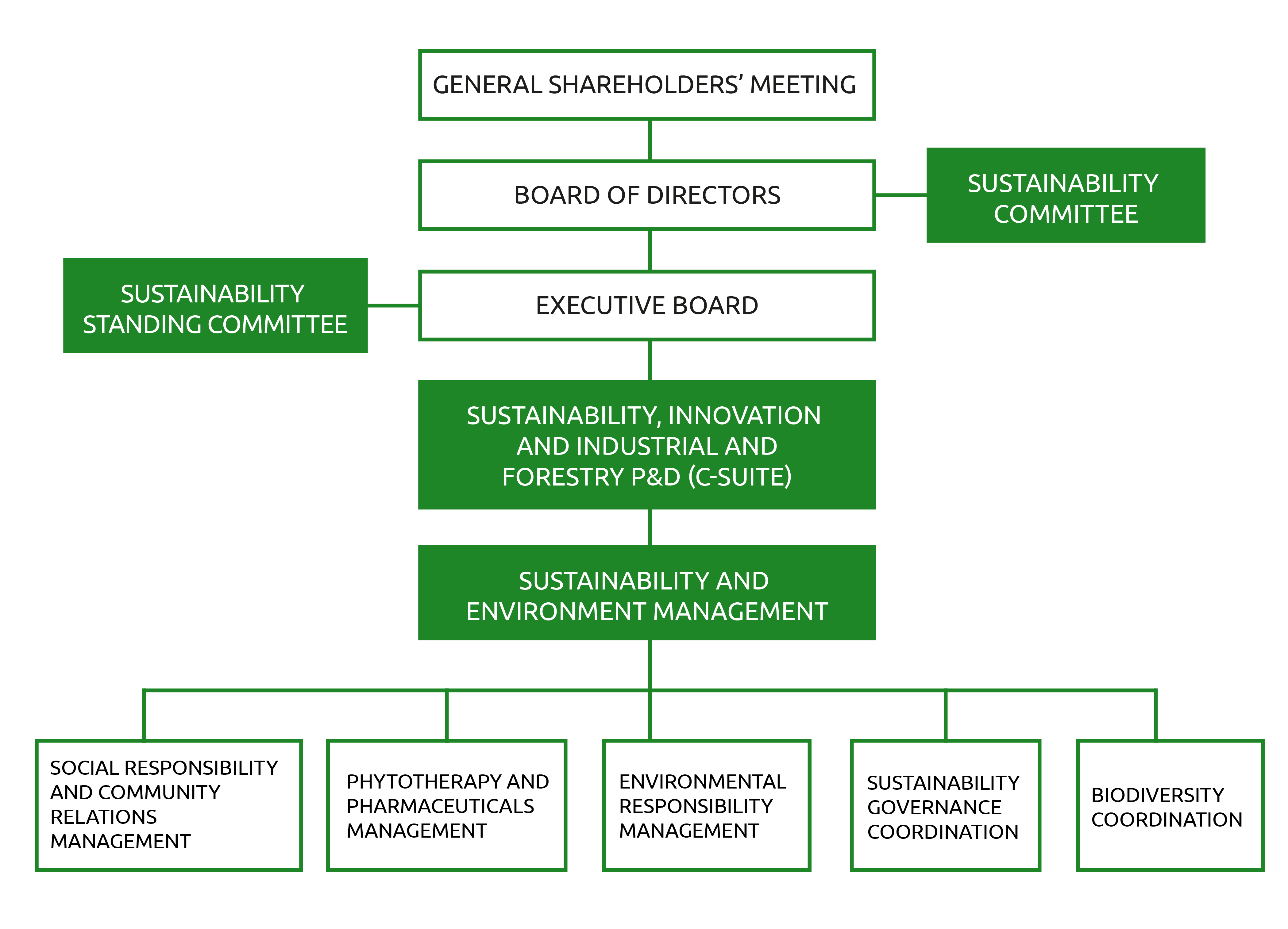 Klabin maintains a well-established governance structure to manage the strategic and operational execution of sustainability-related issues. This structure consists of: 1) Board of Directors advisory committees; 2) standing committees composed of executives to advise the Executive Board; 3) and a statutory board on Industrial Technology, Innovation and Sustainability, as well as corporate policies and internal controls focused on integrated management of sustainability-related risks. The Board of Directors is responsible for ultimate oversight of environmental, social and governance (ESG) issues, supported by dedicated committees such as the Sustainability Committee and the Audit and Related Parties Committee (both made up of board