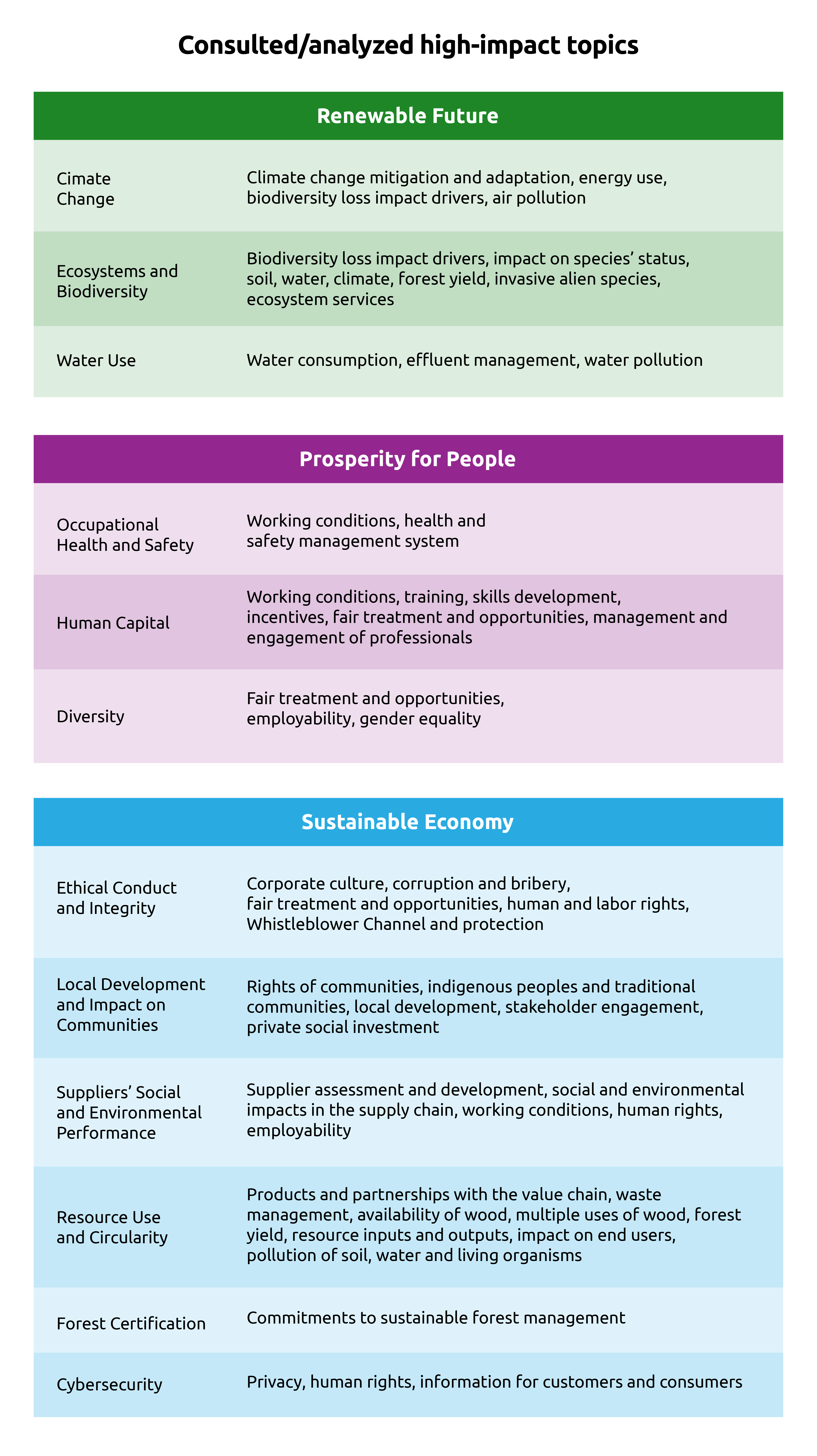An in-depth analysis was conducted of the impacts generated by the 12 topics on stakeholders and the environment. This process was conducted using primary data from reliable sources and recognized tools, in addition to a specific consultation to check the materiality of some topics not considered definitive.